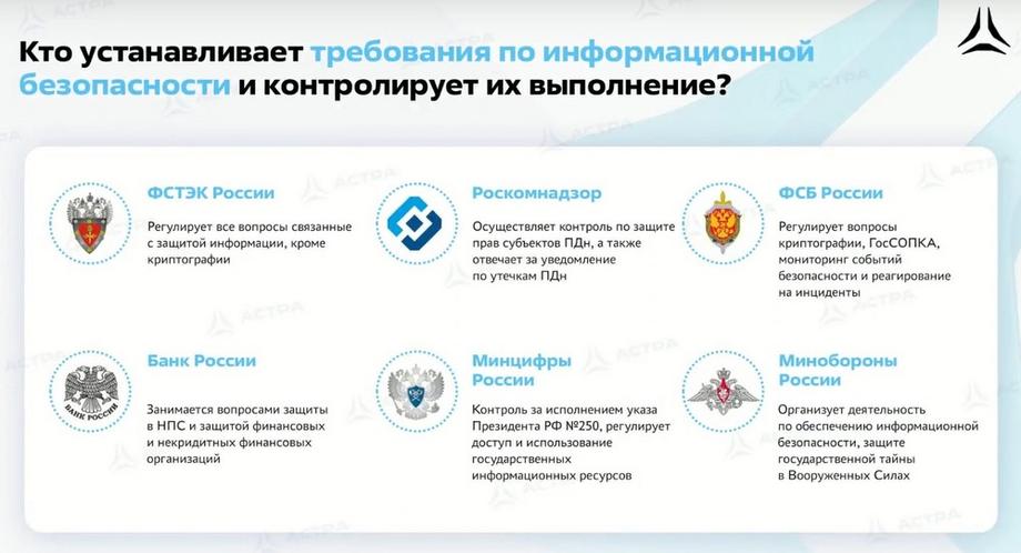 Максим Куртин начал свой рассказ про механизмы защиты «Astra Linux», как она защищает от угроз информационной безопасности самостоятельно и совместно с другими внешними средствами защиты информации. Начал он с регуляторов - это ФСТЭК России, ФСБ России, Минобороны России и Роскомнадзор. У последнего основное – заниматься персональными данными. Есть также Банк России он работает в финансовой сфере и Минцифры.