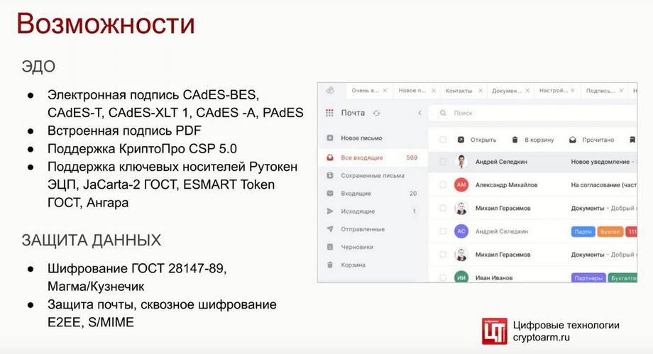 КриптоАРМ третьей версии отличается от предыдущей версии нашего продукта тем, что в него добавлен встроенный почтовый клиент, который отправляет документы получателю в защищенном виде. Тут используется технология сквозного шифрования, при этом весь контент и прикрепленные документы шифруются на устройстве с открытым ключом получателя и дальше на принимающем устройстве он может расшифровать как содержимые письма, так и получить доступ к документам.