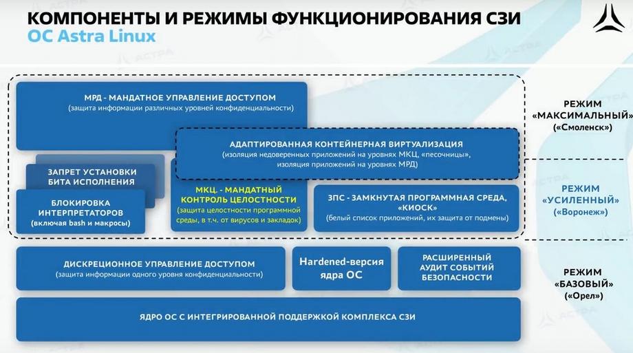 Исполнение «Орёл» – это так называемый базовый режим. Он имеет в своем составе классический набор механизмов защиты, такие как дискреционное управление доступом и расширенный аудит. Поднимаясь вверх по уровню, по режиму усиленный в «Воронеже», он уже начинает включать в себя такие механизмы, как «Мандатный контроль целостности» (МКЦ) и «Замкнуто-программная среда», «КИОСК». В режиме максимальный «Смоленск» уже добавляется «Мандатное управление доступом» (МРД). Механизмы защиты включают в себя такие функции, как замкнутая программная среда.
