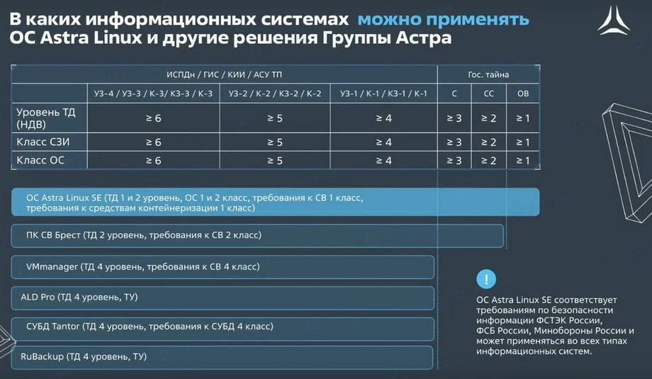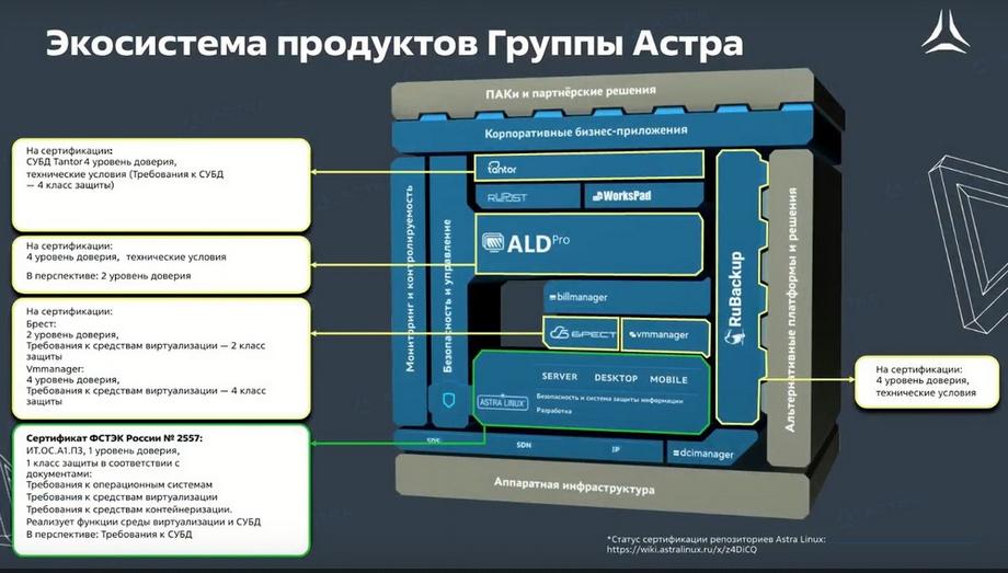 Группа «Астра» сейчас активно хочет обеспечить своих заказчиков как системным так и прикладным программным обеспечением, которое не только само по себе функционирует и помогает решать какие-то задачи, но также интегрируется с другими системами как в части функциональной, так и плане механизмов защиты. Мы сейчас активно сертифицируем наши продукты. Операционная система Astra Linux сертифицирована ФСТЭК России, ФСБ России, и Минобороны России, вплоть до уровня 1. То есть можно на всех уровнях защиты применять Astra Linux, можно использовать в любых информационных и автоматизированных системах. Мы активно идем по направлению сертификации продуктов, таких как ALD Pro, СУБД Tantor, системы резервного копирования и восстановления RuBackUp, и системы виртуализации «Брест» и VMmanager.