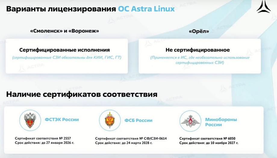 Astra Linux - это применение вплоть до гостайны, до ОВ и остальные продукты у нас до первых классов и уровней защищенности для конфиденциальных систем. Операционная система Astra Linux имеет несколько вариантов исполнения. Не сертифицированный вариант – это версия «Орёл». Она может применяться только там, где нет необходимости защищать информацию. В тех информационных системах, где регуляторы не предъявляются никаких требований. Исполнения «Смоленск» и «Воронеж» сертифицированы под разные классы. «Воронеж» – это исполнение операционной системы для конфиденциальных систем обработки информации. «Смоленск» – это классическая старая версия операционной системы, которая пригодна для применения, в том числе для гостайны. Чем же они отличаются?