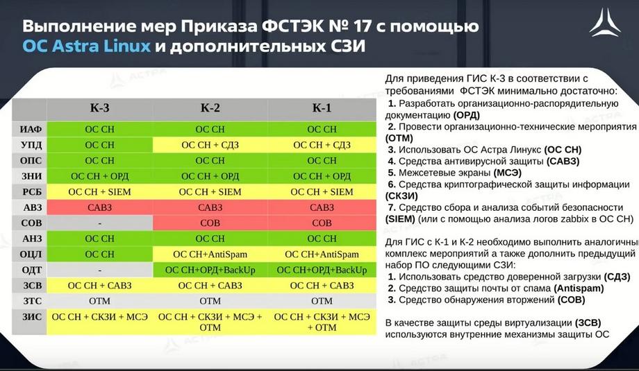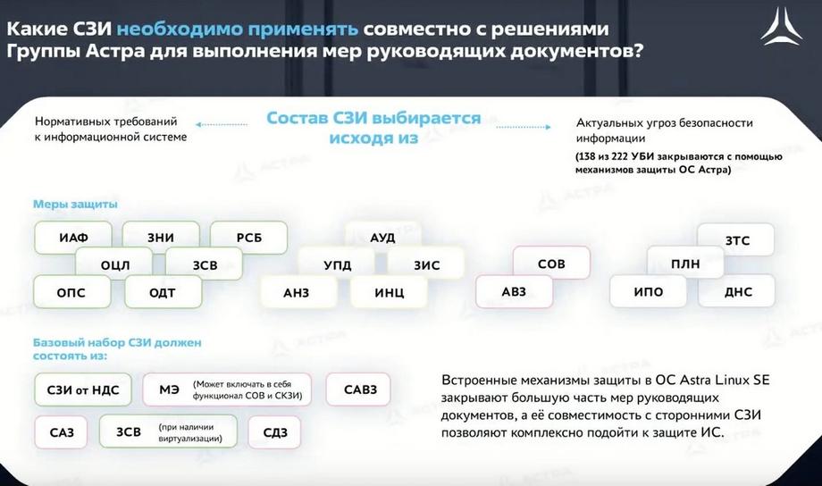 Если рассмотреть именно комплексную систему защиты и как Astra Linux сама может помочь защитить, на примере того же приказа ФСТЭК Россия №17, то мы видим, что Astra Linux не может самостоятельно обеспечить все меры защиты. На тех или иных группах мер защиты нам требуется дополнительное средство защиты, такие как «Управление доступом» (УПД). Есть какие-то уровни, которые вообще нам не подвластны. Это антивирусная защита и средства обнаружения вторжения. Но обеспечив совместимость с продуктами вендоров, производящих внешние средства защиты, мы позволим вам защитить свою систему от всех возможных угроз.