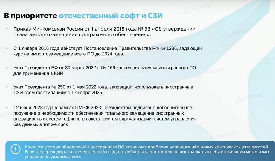 И основные сейчас направления в части нормативных требований, это переход на отечественные средства защиты. Как аппаратные, так и программные.