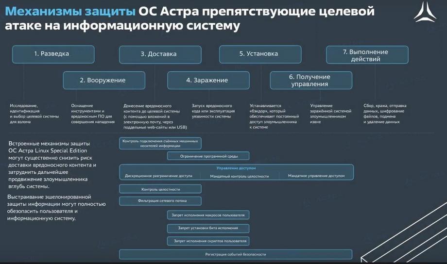 Если рассмотреть весь набор механизмов защиты Astra Linux на некоем этапе атаки на систему, то можно сказать, что Astra Linux позволяет прекратить атаку, остановить её, начиная именно с момента доступа нарушителя к информационной системе, к самой операционной системе. И на каждом последующем этапе механизм защиты препятствует нарушителю в попытке установки вредоносного ПО либо получения доступа. Но, к сожалению, сама по себе ОС Astra Linux не может защитить от всех угроз, которые существуют, выполнить все требования, которые предъявляют к информационным системам регуляторы.