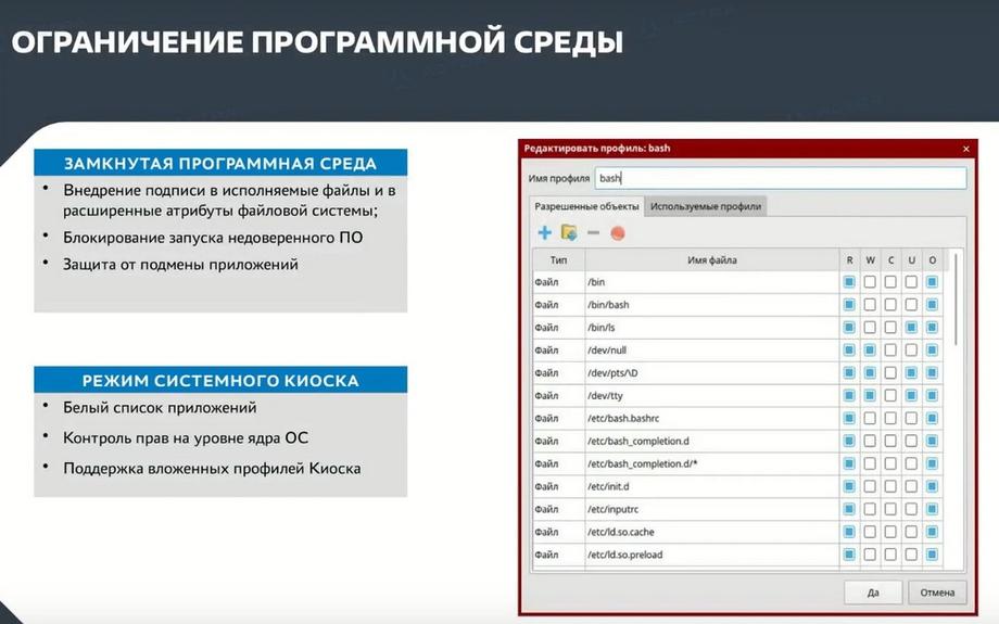 Это соответствует подписи всех исполняемых и запускаемых файлов электронной цифровой подписью, выпущенной нашей компанией, всех исполняемых файл, входящий в состав Astra Linux, а также всего проприетарного ПО, которое выпускают наши партнеры, либо другие производители программного обеспечения. Если запущен механизм программной среды, то ни один файл не запустится без проверки ЭЦП. Режим киоска - это классический режим белого списка приложений. Запускаем только то, что разрешено конкретному пользователю, конкретной группе или так далее.