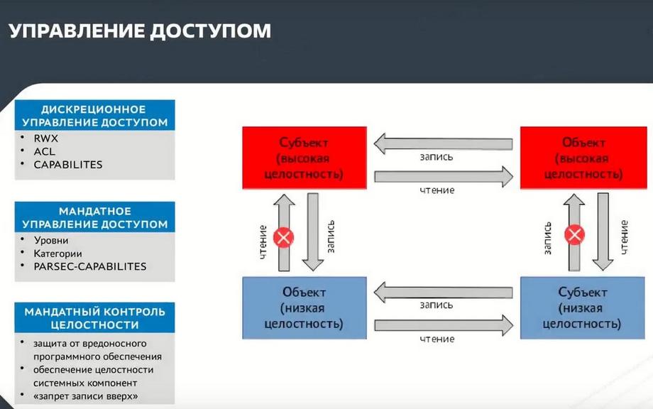 Мандатный контроль целостности. Это механизм разделения всех сущностей внутри операционной системы на уровни. Грубо говоря, пользователи работают на нулевом уровне, а администратор - на высшем на 63-м уровне. Это дает контроль записи. Сейчас на картинке показан мандатный контроль целостности. Субъекты с одинаковым уровнем могут работать друг с другом, а субъекты с более низким уровнем на более высокий не смогут достучаться. Это именно контроль защиты от вредоносного программного обеспечения, это обеспечение целостности системных компонентов. То есть мы разделили всю систему на условные 63 уровня и контролируем обращение внутри системы между собой.