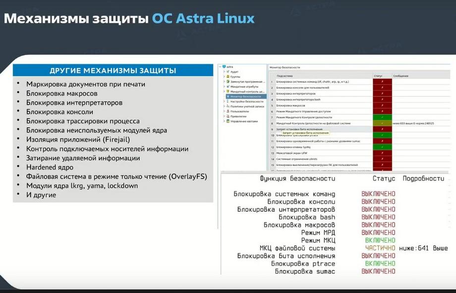 Но это не все механизмы защиты, которые присутствуют в Astra Linux. У нас есть так же встроенные механизмы. Как маркировка документов при печати, маркировка макросов, интерпретаторов, маркировка консоли. Они имеют графические интерфейсы, их можно включать и выключать. Всё опять же определяется администратором безопасности и зависит от степени угроз информационной системе, от предъявленных требований к этой информационной системе.