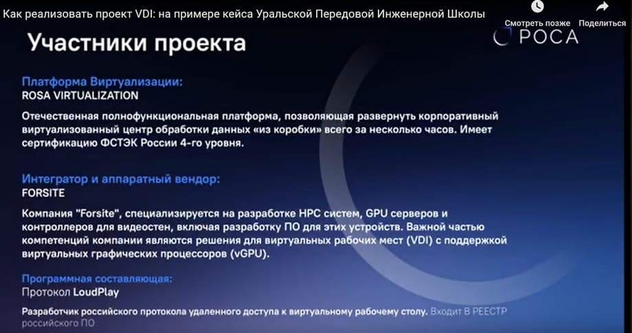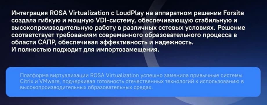 Мероприятие дистрибьюторской компании OCS, а также российского разработчика системного и инфраструктурного ПО НТЦ ИТ РОСА и российского разработчика высокопроизводительных решений, расчётных комплексов и систем визуализации Forsite. На этом мероприятии спикеры компаний рассказали, как создать полностью функциональное и эффективное решение VDI с использованием серверов Forsite на базе отечественного программного обеспечения Rosa Virtualization и LoudPlay.