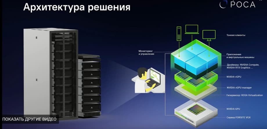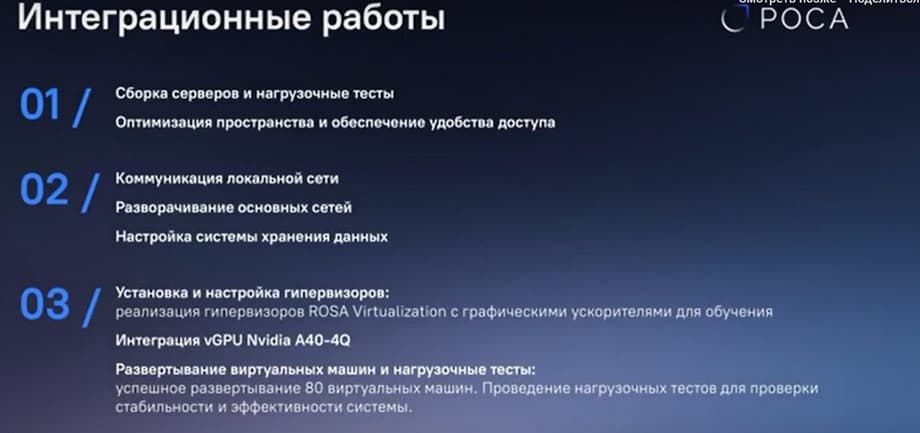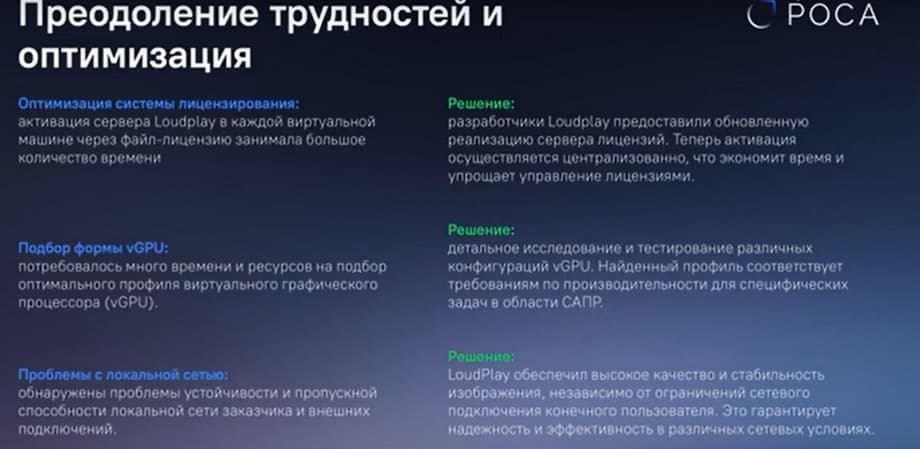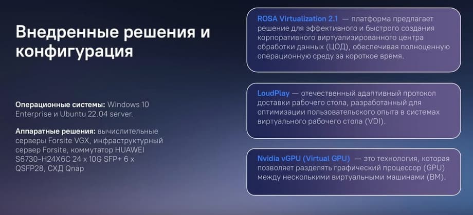 Мы уже проводили изыскание, где-то с год назад, какие платформы российских вендоров могут работать с vGPU и с протоколом LoudPlay. Самое, наверное, оптимальное решение с нашей стороны нам показалось, что это именно ROSA Virtualization. которая обеспечивает и удобство работы, и высокопроизводительные действия в разных условиях. Именно такой комплект нам показался для данного проекта оптимальным. Соответственно, система была изначально спроектирована достаточно отказоустойчивой. Даже при потере одного сервера пользователь терял максимум 8 виртуальных рабочих столов, что в принципе тоже устраивает заказчика как режим отказоустойчивости. Также были зарезервированы СХД и сетевые подключения.