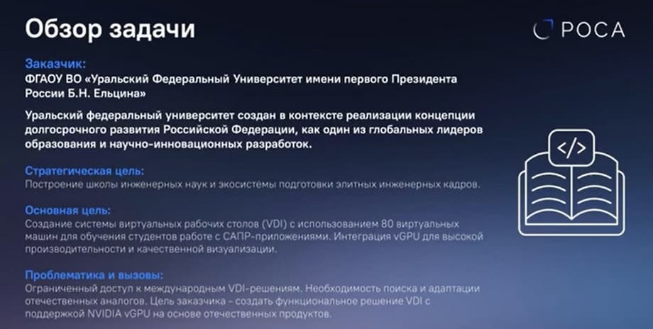 Основная цель, которая стояла перед университетом, состояла в том чтобы построить VDI-инфраструктуру для обучения студентов в школе инженерных наук или передовой инженерной школе (ПИШ). Специфика состояла в том, что обучение включало работу в САПР, то есть в системах автоматизированного проектирования. Таким образом, на тонких клиентах должна была работать полноценная 3D-графика, т.е. там используется Siemens NX. Вот представьте себе 80 рабочих мест, на каждом из которых нужно установить САПР и каждое из которых нужно наполнить к очередному занятию необходимым содержимым. Задача очень тяжелая. И здесь как раз на помощь приходит VDI. Создаются шаблоны виртуальных машин. И в нужный момент студент получает доступ к такой машине, наполненной именно тем, что нужно ему в данный момент. Но есть две тонкости. Решение должно быть отечественное, во-первых. А во-вторых, оно должно поддерживать технологию vGPU от NVIDIA. vGPU - это технология разделения мощностей 3D-видеокарты между несколькими виртуальными рабочими местами. То есть карта ставится на хост виртуализации, а её мощности задействуются в нескольких виртуальных рабочих местах. Оказалось, что подходящее решение существует и основано она на системе виртуализации от компании ROSA. Мы подробно расскажем сегодня о её возможности. Сначала несколько слов о компании НТЦ ИТ РОСА.