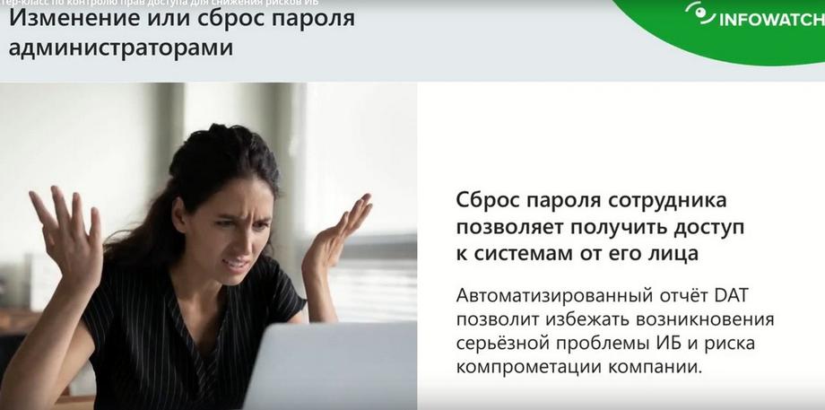Следующий интересный пример. Изменения или сброс пароля администраторами. У нас есть аналитический центр в нашей компании. И очень многие инциденты, связанные с кражей информации, даже с их порчей, связаны с тем, что, простой пример, высокопоставленный сотрудник уезжает в отпуск, ему сбрасывается пароль и устанавливается новый и от его лица производятся различные нехорошие действия. Эти примеры они сейчас на рынке очень хорошо известны. Изменение или сброс пароля является как раз одним из способов, кстати, это можно сделать и программно, не обязательно, чтобы администратор взял руками и сбросил кому-то пароль и поставил свой собственный. А потом сделал настройку, что при первом входе человек, вернувшийся из отпуска, из командировки, должен ввести этот пароль. Какой-нибудь современный троян вполне это может сделать. Эта система должна понимать и отсекать. Безопасник тут же должен это видеть.