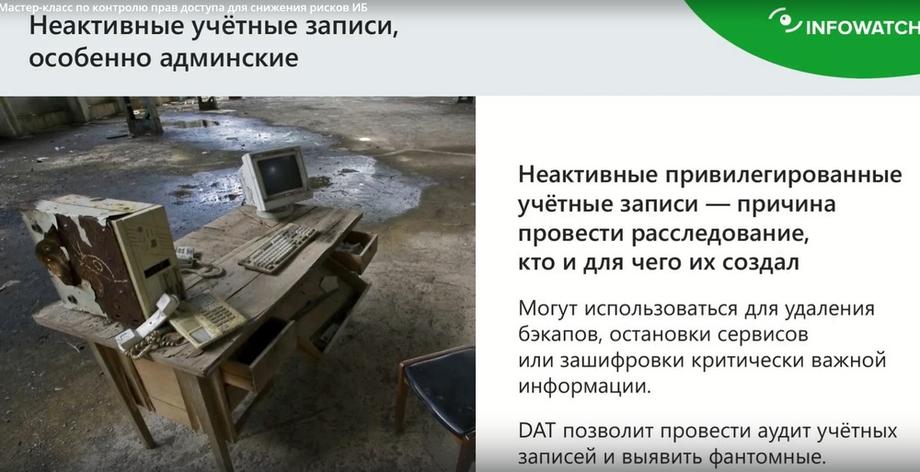 То есть сотрудники IT-отделов, особенно в крупных компаниях, часто меняются, причем не только IT, но и support, и devops, и так далее. И сотрудники, находящиеся под увольнением, но всё еще обладающими высокими правами, они могут создавать так называемые фантомные учетные записи. Мы называем их фантомными, потому что они вроде есть, но не активны, они админские, из-под них можно натворить много бед.
