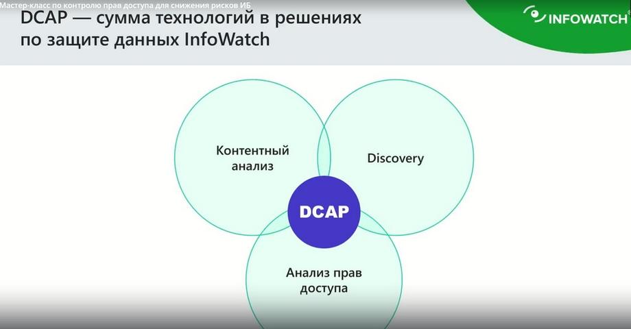 Таким образом, DCAP должна проводить аудит данных. Где они находятся? Должен проводиться аудит служб каталогов, потому что службы каталогов несут в себе полную информацию о пользователях, которые мы в дальнейшем используем для назначения прав доступа аксесс-листов в любую систему. DCAP должна проводить классификацию данных, чтобы понять, а что за данные появились на открытой шаре. И почему? ДСП находится в папке паблик или находилась буквально в течение 5 минут, а потом кто-то убрал, но за это время человек 100 уже раскачали. DCAP должна регулярно проводить мониторинг, проводить аудит, контролировать изменения, которые происходят как в правах доступа, как в распределении документов внутри компании, то есть должна постоянно перестраиваться карта или инфополе. Если мы говорим про наше новое решение, Data Access Tracker – это что-то связанное с DCAP. Поэтому мы название решили не менять, для того чтобы никого не путать.