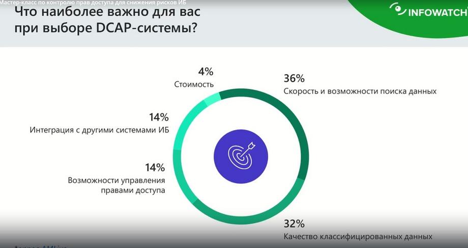 Здесь мы воспользовались результатами опроса наших коллег из AM.Live, опроса слушателей мероприятия, посвященного защите не структурированных данных. В первую очередь мы сегодня будем говорить про те данные, которые находятся внутри периметра организации. Это может быть все что угодно. Это данные, которые находятся на файловых серверах, на порталах, в базах данных, в CRM, ERP и так далее. То есть данные, которые находятся внутри. Особенно важны те данные, которые представляют особую важность для компании, которые являются частью бизнес-процессов. Утечка которых или же их компрометация может привести к довольно печальным последствиям. Причем мы здесь говорим не просто про документы вордовые, pdf, но и также про файлы настроек. Файлы настроек почтовой системы, application серверов, web-серверов, баз данных, настроек конфигурации, почтовые архивы, backup и так далее. То есть вся ценная информация, которая нужна для жизнедеятельности компании и находится внутри нее. Но с небольшой оговоркой. Сейчас очень многие компании используют обычные ресурсы - это Яндекс 360, Clouds, Verge Cloud и так далее. Сейчас очень много на рынке предложений таких вот корпоративных систем на замену ушедшему офису Microsoft 365. Утечки и контроль ухода данных и контроль прав доступа данных в таких облачных ресурсах тоже важный процесс, мы в этом направлении также общаемся активно с вендорами на предмет обеспечения дополнительного слоя безопасности и контроля прав доступа. Таким образом, когда мы говорим про защиту не структурированных данных внутри организации, что первое пришло на ум респондентам и слушателям мероприятия по DCAP. Ну, во-первых, все сказали про шифрование данных и про антивирусную защиту. Это совершенно верно. Но обратите внимание, здесь мы четко видим два так называемых домена. Один домен — это связан с защитой непосредственно данных, путем их шифрования, чтобы нельзя было расшифровать, но любые данные можно взять и удалить. Шифрованные данные тоже здесь не исключение. Защита от вредоносных программ. Тут имеется в виду не просто антивирусная защита, но и система класса EDR, которая позволяет защитить данные от угроз, связанных с различными вирусами, троянами, шифровальщиками и так далее. Совершенно отдельно и с большими процентами у нас стоит аутентификации пользователей – 21%. Соответственно, все мы понимаем, что очень важно контролировать право доступа пользователей к определенной конфиденциальной информации. И на самом деле, это основная задача DCAP или DAC System. DAC – это немножко устаревшее название, Data Access Governance сейчас используется. Data Control Access and Protection. Более того, я скажу, это аббревиатура, введенная несколько лет назад Gartner, она тоже компанией Gartner, уже считается устаревшей. Потому что DCAP-система, она на самом деле включает в себя довольно много компонентов. И аутентификация пользователей, контроль прав доступа, является необходимым модулем этих систем. И сейчас, вот видите, рядом с DCAP находится DLP. они не просто так находятся рядом. Несмотря на то, что DLP традиционно использовалась для того, чтобы контролировать утечки, но сейчас мы понимаем, что и контроль доступа внутри организации, он также важен.