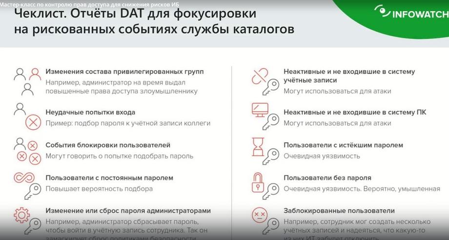 Сформируем чек-лист по предотвращению атак на информационные активы через уязвимые учетные записи пользователей и изменения групп доступа.
