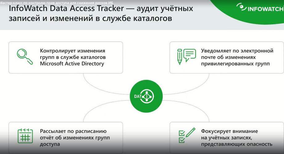 Соответственно, когда мы говорили про контроль прав доступа, мы упомянули про изменение в службе каталогов. Ну, так как большинство из вас наверняка уже знакомы с линейкой продуктов InfoWatch, и вы знаете, что вот этого модуля как раз у нас и не хватало. Что происходит в службе каталогов и как это приводит к изменению прав доступа по документам, мы, к сожалению, понять не могли. И как раз этот модуль DAT, он закрывает потребность в контроле и аудите служб каталогов.