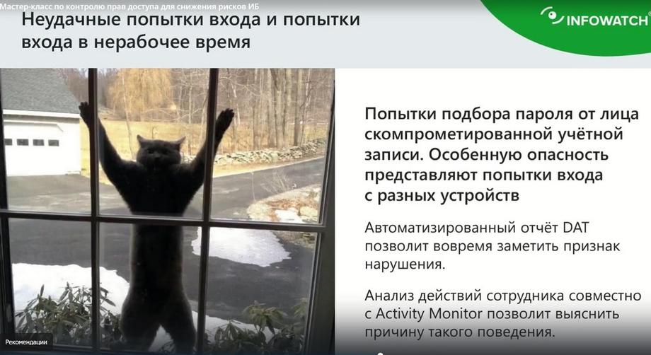 Неудачные попытки входа и попытки входа в нерабочее время тоже представляют довольно большой интерес, более того, я скажу, что есть система так называемого класса UBA – User Behavior Analysis. И вот такие вот случаи, они там подсвечены с максимальным приоритетом, потому что это нестандартное поведение сотрудника, это отклонение, а любое отклонение – это аномалия. Если вы видите, что сотрудник обычно работает условно с 9 до 18, И вдруг он начал заходить в систему в субботу вечером, еще и не с первого раза. Это повод для безопасника начать беспокоиться и разобраться, что, собственно, такому сотруднику понадобилось в не рабочее время, и повод выяснить, откуда происходят заходы по имени устройства, по его айпишнику. В системах так называемого класса CAS-B есть карты обычной GEO IP, которые показывают, откуда сотрудники в кавычках входили, потому что обычно это попытки взлома. Да, такие многократные неудачные попытки входа должны блокироваться, неактивные учетные записи, особенно админские.