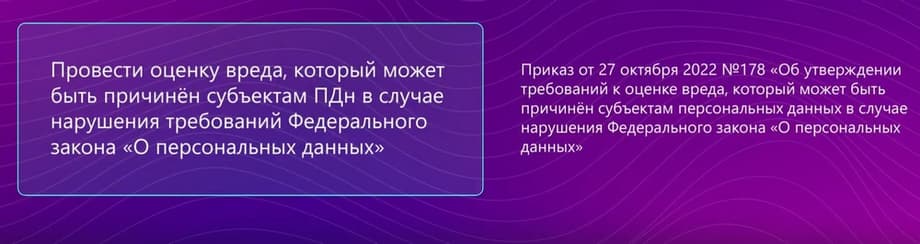 Переходим к следующему шагу. Оценка возможного вреда, который может быть причинен субъектам персональных данных. Совершенно недавно был получен приказ номер 178 об утверждении требований к оценке вреда, который может быть причинен с объектом персональных данных в случае нарушения требований федерального закона. Вы обязаны провести проверку и оценить ущерб. Здесь должен быть оформлен соответствующий документ, это акт, и он является обязательным. После того, как мы оценили ущерб от невыполнения требований 152-го федерального закона, мы должны перейти с вами к информационным системам по обработке персональных данных.