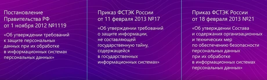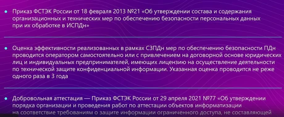 Существует три документа, которые позволят создать грамотную правильную относительно законодательства РФ систему защиты персональных данных. Есть у нас приказ №17, который регулирует требования в отношении государственных информационных систем персональных данных. Есть приказ №21, который, говорит какие требования организационные и технические должны быть выполнены в отношении информационных систем персональных данных. Есть разница между 17 и 21 приказами. Она ощутима, поэтому если мы имеем отношение с государственной информационной системой, здесь есть нюанс, о котором речь пойдет позже.
