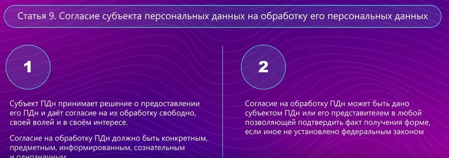 И здесь, наверное, стоит обратить внимание, что субъект персональных данных принимает решение о предоставлении его персональных данных и дает согласие на их обработку согласно своей воле. Это очень важно. Согласие на обработку должно быть конкретным, предметным, информированным, сознательным и однозначным. Согласие мы прописываем, помимо того, что кто дает согласие, кому дается согласие, перечень персональных данных, а также мы прописываем способы обработки, цели, для чего дается согласие, обязательно в какие сроки.