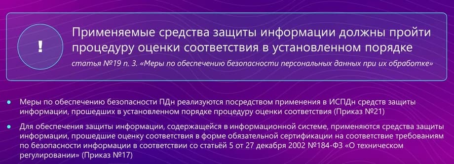 После того, как мы разработали технические задания и проект системы защиты персональных данных, нам необходимо закупить средства защиты, установить их на настройку. Не стоит забывать о том, что средства защиты должны пройти процедуру оценки в соответствии с установленным порядком.