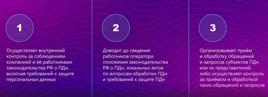 Первым шагом для того, чтобы выполнять требования законно, необходимо назначить ответственное лицо согласно требованиям закона. Оно обязано осуществлять внутренний контроль за соблюдением требований законодательства в области защиты персональных данных. И этот специалист на постоянной основе должен проводить аудит всех существующих процессов обработки данных. Он должен доводить до сведения работников компании, в которой он работает, все положения о законодательстве в области защиты персональных данных и их обработки. Есть еще один момент, который лицо ответственное за организацию обработки должно сделать. Это прием обращений и запроса со стороны субъектов персональных данных, а также уполномоченных органов.
