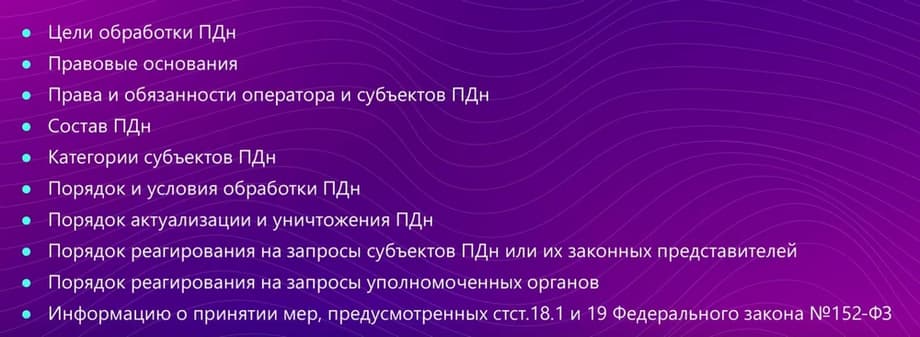 Следующим шагом, причем одним из ключевых, является разработка политики в отношении обработки персональных данных. Мы обязаны определить цели обработки, правовые основания, права и обязанности компании, как оператора персональных данных. Также мы определяем права и обязанности субъектов персональных данных, перечисляем те персональные данные, которые мы обрабатываем внутри компании. Мы определяем категории субъектов, чьи персональные данные обрабатываются. И самое важное - это порядок и условия обработки тех данных, которые мы имеем. То есть, что мы делаем с данными, какими способами мы их обрабатываем и так далее. Мы определяем порядок уничтожения этих данных, дополнения. То есть, все, что касается статей федерального закона. Мы определяем порядок реагирования на запросы и порядок реагирования со стороны полномочных органов. И конечно же не забываем о статье 18.1.19 тех требований по безопасность и мерах, которые мы обязаны выполнить в отношении персональных данных. Не забываем о том, что политика в обработке персональных данных она направлена на обеспечение законных прав и свобод субъектов персональных данных.