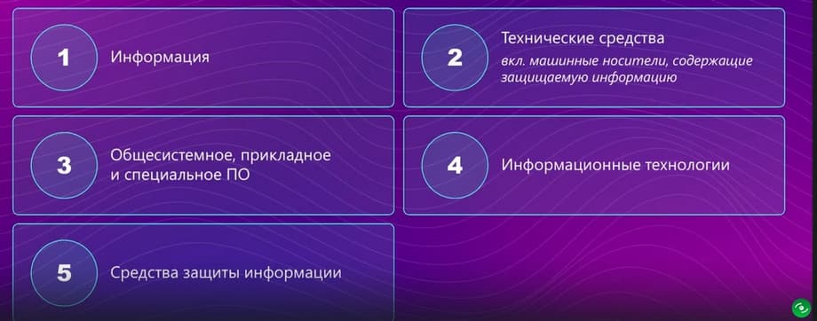 Объекты защиты. И для информационного системы персональных данных под объектом защиты мы понимаем всё. Это и информация, которая содержится в информационной системе персональных данных, и технические средства, с помощью которых мы обрабатываем персональные данные, и программные средства, и те информационные технологии, которые позволяют нам идти в обработку.