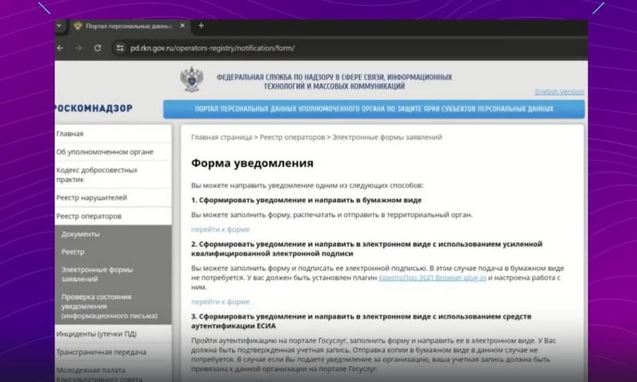 Уведомления в Роскомнадзор оно может быть направлено в двух видах, в бумажном или электронном. Если мы говорим о бумажном виде, то на бумажном носителе с подписью генерального директора компании мы направляем в адрес территориального органа. Если же мы говорим про электронный вид, мы заходим на сайт Роскомнадзора, заполняем все необходимые поля и направляем уведомления в Роскомнадзор. Не стоит забывать о том, что после того, как мы направили уведомление в Роскомнадзор, есть случаи, если у вас произошли какие-то изменения, как операторов в отношении обработки персональных данных, и эти изменения касаются уведомления в Роскомнадзор, мы обязаны внести соответствующий правки в уведомления. Об этом тоже вы можете узнать на сайте Роскомнадзора. Еще есть такой момент, что для того, чтобы проверить, что вы являетесь оператором персональных данных и Роскомнадзор действительно получил ваше уведомление, которое вы направляли ему, вы можете воспользоваться реестром операторов и найти вашу организацию.