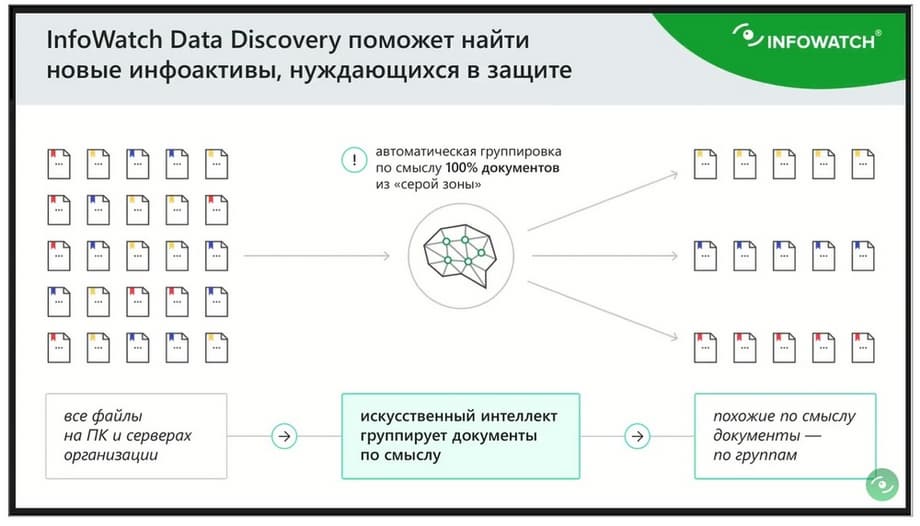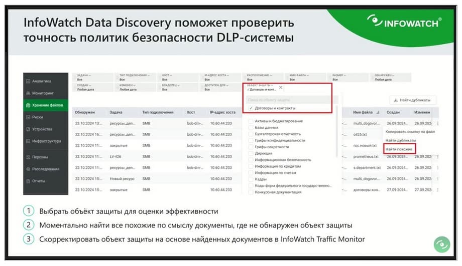 Data Discovery производит аудит файлов, документов внутри компании, также показывает права доступа. Сейчас в Data Discovery присутствуют два дополнительных мощных компонента. Во-первых, это категоризация документов по смыслу, она не требует DLP, это внутренний компонент Data Discovery. Более того, подчеркну, что он бесплатный для наших клиентов. Этот компонент позволит быстро разбить все документы по смыслу. И, во-вторых, появляется контентный анализ с теми же объектами защиты, которые уже настроены в Traffic Monitor. В этом прелесть кросспродуктового взаимодействия в рамках единого центра расследования.