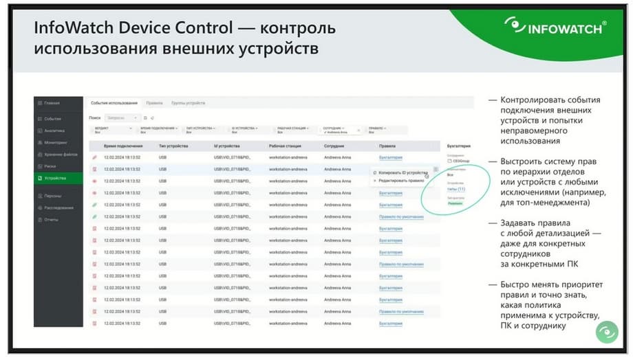 И третье решение, не менее полезное, называется Device Control. Мы выпустили это решение недавно. Когда мы говорим про контроль файловых директорий или контроль изменений службы каталогов, мы забываем про один важный аспект. А кто, собственно, все это делает? Мы забываем именно про пользователей. Что на самом деле в итоге безопасник придет к определенному сотруднику, и спросит у него, зачем ты это сделал, зачем ты поменял права, зачем тебе вот этот документ нужен? Сотрудник получил-таки доступ к ценной информации, который он иметь вообще-то не должен. И пытливый сотрудник пытается придумать, каким образом эту информацию теперь куда-нибудь увести и поделиться со всем миром, потому что это очень важно. Сотрудник знает, что в контуре стоит DLP, и значит, перекидывать этот файл куда-то на почту или на веб бессмысленно. Он тут же запалится, и его накажут за такое действие. Значит, остается возможность что-то сделать с личным устройством. Возможно, зашифровать, чтобы агент это не увидел, переименовать, расширение поменять и т.п. И здесь Device Control будет стоять на страже того, чтобы у пользователя не появилась возможность воспользоваться каким-то личными переносными устройствами. И задача Device Control состоит в том, чтобы контролировать использование таких внешних подключаемых систем.