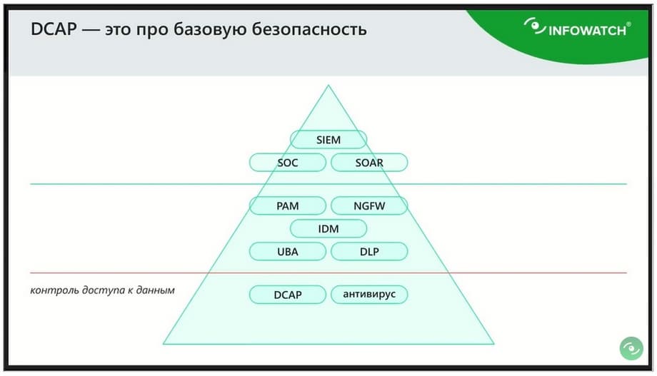 Естественно, тут присутствует DLP. Потому что DCAP и DLP — это родственные системы, и DCAP использует функциональность с возможностью существующей настройки DLP, и, конечно, наверху мощные системы, в которых также есть возможность интегрировать DCAP в тот же SIEM, тем самым облегчая взаимодействие с этими системами и улучшая управляемость информационной системы.