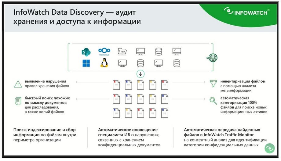 И, естественно, Data Discovery остается одним из компонентов, работающих с Traffic Monitor и, практически, обеспечивающим реализацию концепции data at rest и естественное реагирование политик внутри Traffic Monitor.