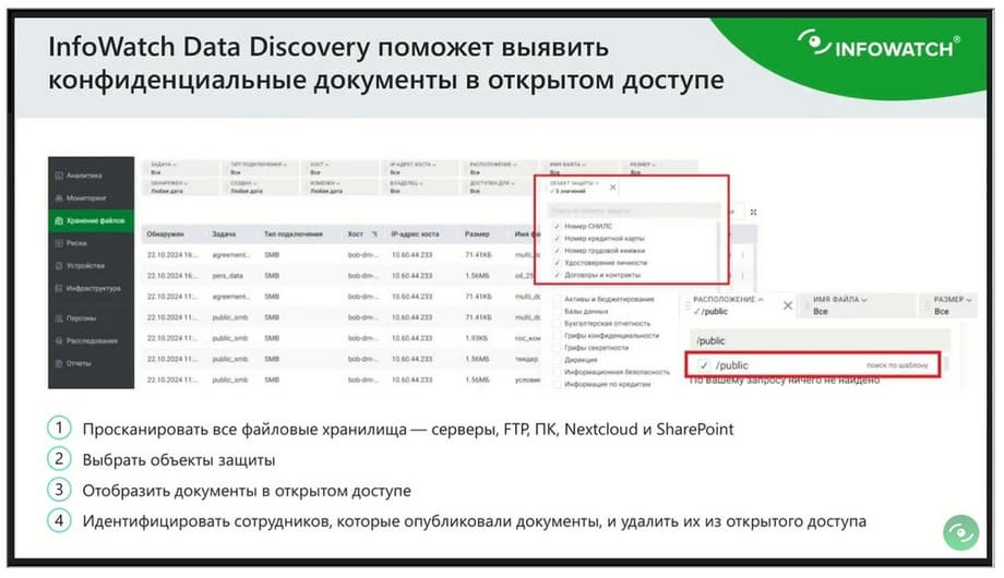 Основной задачей Data Discovery является проведение файлового аудита, с тем, чтобы мы имели возможность посмотреть где, что лежит, кто к этому имеет доступ. Теперь, обладая информацией о содержимом документа, Data Discovery позволяет безопаснику быстро понять, где какие находятся документы, и находятся ли эти документы в открытом доступе. Задавая в интерфейсе центра расследования простейшие фильтры, мы можем увидеть, например, что важный финансовый документ находится в папках паблик, а это серьезное нарушение.
