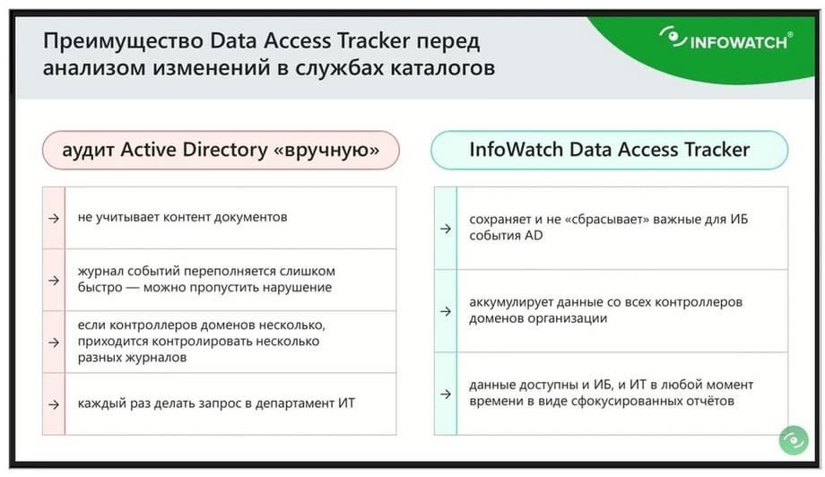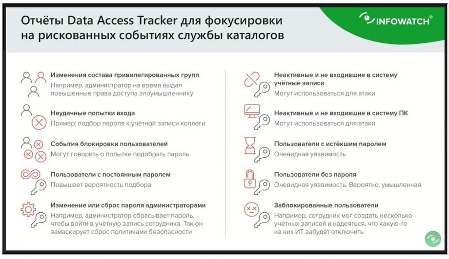 Кроме того, Data Access Tracker как система работы с событиями службы каталогов/ При этом DCAP это не только про аудит службы каталогов, это вообще про защиту данных и работа с правами. Как в любой DCAP системе, в Data Access Tracker довольно много отчетов. Даже в первой версии, которую мы выпустили примерно полгода назад, уже было больше десяти отчетов, фокусирующих безопасника на различных проблемах конфигурирования активной территории. Мы проводим интервью с нашими заказчиками, мы собираем обратные связи и дорабатываем систему по требованиям заказчиков. Все они основаны на реальных жизненных сценариях. И Traffic Monitor и Data Discovery, и activity-мониторы, и vision, все они построены на живых сценариях. Там нет пустого функционала, который непонятно как использовать. Здесь то же самое, в Data Access Tracker большое количество отчетов, но все они важны, под ними всегда скрывается определенный сценарий.