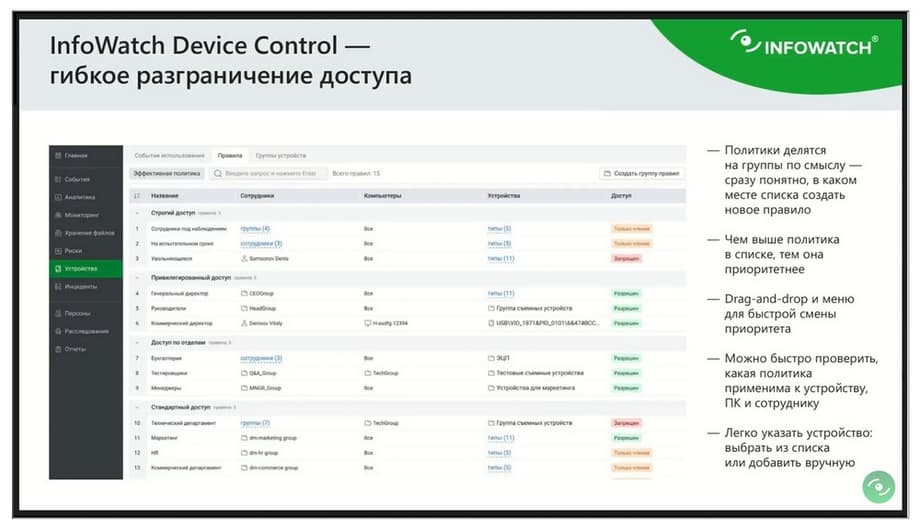 Довольно обширный список как раз закрывает все возможные пути украсть важный документ, переписать его куда-то и т.д. Политики, которые используются в Device Control, позволяют, во-первых, приоритезировать их, во-вторых, группировать. Можно группировать по отделам, по сотрудникам, по сотрудникам под подозрением, кто использует AMOV Prediction. Можно автоматически определять, какие устройства подключаются к персональным компьютерам пользователей и включать их в политики. И Device Control как раз основывается на таких понятиях, как пользователь-устройства-компьютер. Те, кто работает с сетевыми девайсами, я думаю, поняли отсылку к так называемому Zero Trust, когда не доверяем никому. Если говорим про сетевые устройства и Zero Trust, это пользователь-компьютер-приложения. У нас такой же подход, только добавляется устройство. И в политике как раз можно все жестко задавать. Или мы хотим полностью блокировать подключение, или мы хотим дать только возможность чтения информации с этого устройства, но ни в ком случае не запись. И, конечно, в событиях использования сотрудник ИБ увидит, что, и какие действия совершает сотрудник с внешне подключенным устройством. Сейчас очень популярно подключать по проводу телефоны. Телефоны таким образом будут подключены, но не будут доступны.