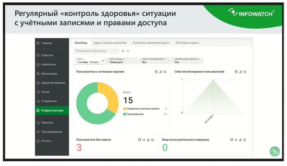 Вот, допустим, изменение или сброс пароля администраторами. Это когда высокопоставленный сотрудник уходит в отпуск, его пароль сбрасывается кем-то из администраторов и временно устанавливается новый. Из-под этого сотрудника, который ушел отдыхать, можно получить доступ к большому количеству данных. Когда сотрудник возвращается, он предлагает сменить пароль на новый, он меняет пароль и ничего не подозревает. В это время человек, который работал под его учетной записью, сидит, радуется, как много всего он нашел интересного в своей собственной компании.