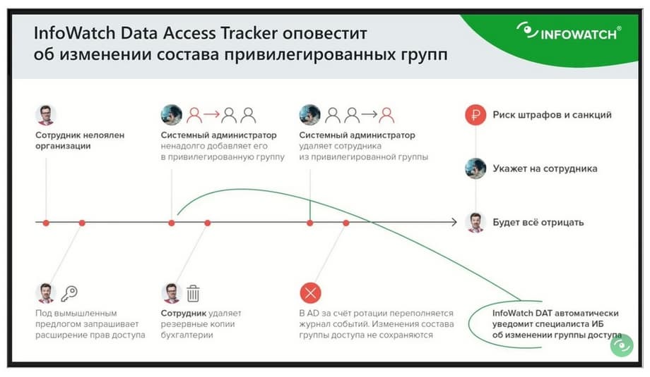 Таким образом появилась идея нового продукта, мы его назвали Data Access Tracker, задачей которого является проведение исследований, изучений, изменений в службе каталогов на предмет выявления изменения прав доступа к документам. Потому что специфика DCAP в том и заключается, чтобы понять, насколько правомерно выданы права доступа, насколько их изменения валидны. И изменение состава групп довольно важный сценарий с точки зрения DCAP, поэтому вот этот слайд как раз фокусирует нас на выполнение сценария, когда пользователь по каким-то причинам неправомерно попал в привилегированную группу. Помните, я в самом начале говорил про нелояльных сотрудников, и о том, что их стало довольно много появляться в организациях? Мы должны привыкнуть к мысли, что надо что-то с этим делать. Более того, последние исследования показывают, что такие нелояльные сотрудники имеют тенденцию сбиваться в кучки, и эти кучки могут представлять сотрудников из разных департаментов. И сценарий, состоящий в том, что один человек дал доступ другому, регулярно встречается в реальной жизни. Временный доступ, постоянный доступ. Я уже молчу про работу различных вирусов, вымогателей, которые повышают все привилегии, создают фейки в учётные записи, включают их в различные группы доступа и получают иногда неограниченные права на изменения в системе.