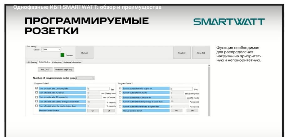 Если это компьютерные розетки, то их тоже две группы. Что можно делать? Можно назначать ведущей ту или иную группу розеток. Вы можете сами определять, какая из групп розеток будет ведущей. Второе, вы можете настроить выключение второй группы розеток, т.е. не критично нагружать, либо по времени, либо по остаточной емкости аккумулятора. Вы сами можете определять, насколько вам критично поддерживать работу основной нагрузки. Если она более критична, то можно поставить условием при достижении, например, остаточной емкости в 60%, чтобы ИБП питал только основную нагрузку. У большинства других вендоров данный функционал не поддается калибровке, обычно зашита остаточная емкость на пределах 20-30%. Далее он автоматически отключается, и никакой регулировки нет. Мы же имеем возможность перепрограммировать данный функционал.