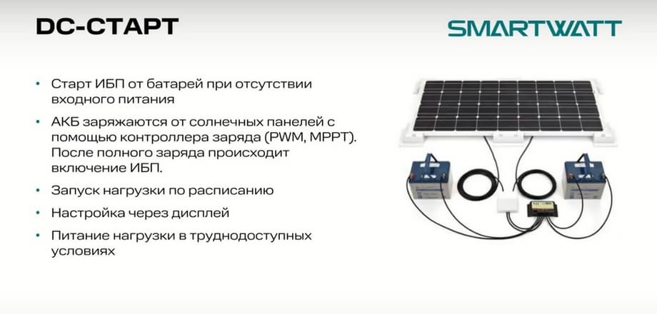 Как функционирует данная связка? Например, на каком-то объекте, питание включается по определенному временному графику. В таком случае можно настроить так, что ИБП включался в нужное вам время. Допустим, у вас питание включается в 14.30, а выключается в 18.00. Вы можете настроить так, чтобы ИБП включался с 15.00 до 17.00 и питал нагрузку. Либо, если питания на объекте вообще нет, то собирается связка: солнечная батарея - контроллеры - аккумуляторы и ИБП. Настраивается уровень заряда. ИБП постоянно мониторит ситуацию, и при достижении необходимого уровня заряда аккумуляторов он включается и начинает работать, питать нагрузку. Эта функция может быть задействована на удаленных метеостанциях, в каких-то измерительных приборах, либо на режимных объектах. Объект питается нагрузкой, передаются данные, солнце село, аккумуляторы разрядились, он перешел в ждущий режим и ждет следующего дня. Это такая функция, которая интересна для удаленных труднодоступных объектов.