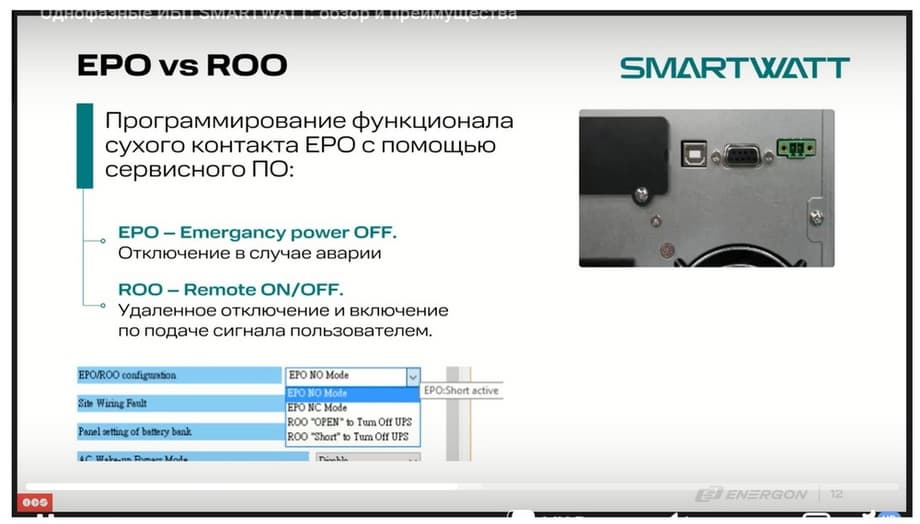 У нас есть сухой контакт EPO. Напомню, функция EPO – это возможность удаленного отключения источника бесперебойного питания от нагрузки в случае аварии.