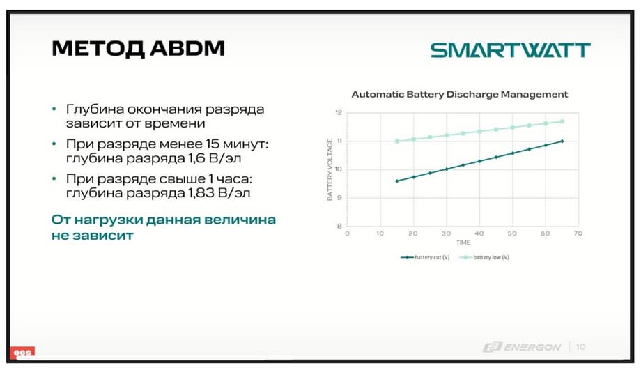 Он начинает работать, когда аккумулятор длительно разряжается малыми токами. Как вы знаете, если ситуация с длительным разрядом малыми токами у аккумулятора часто повторяется, возникает большой риск КПД 0,9 в них. При разряде малыми токами возникает риск сульфотации. Это приводит к тому, что, если ситуация с длительными разрядами повторяется на объекте постоянно, то с течением времени аккумулятор быстро выходит из строя, даже несмотря на его изначально высокое качество. Для того, чтобы этого не происходило, система ABDM автоматически с течением времени (тут шкала времени отражена) начинает поднимать нижнюю границу максимальной глубины разряда аккумулятора. Таким образом, мы избегаем возникновение сульфотации в аккумуляторе, и в нем сохраняется максимальная емкость. Да, незначительно теряется (на 5-7%) время резерва, но при этом заказчик сможет эксплуатировать внутренние аккумуляторы максимально возможный срок, т.е. практически весь срок службы. Для этого используется данная методика автоматического разряда.