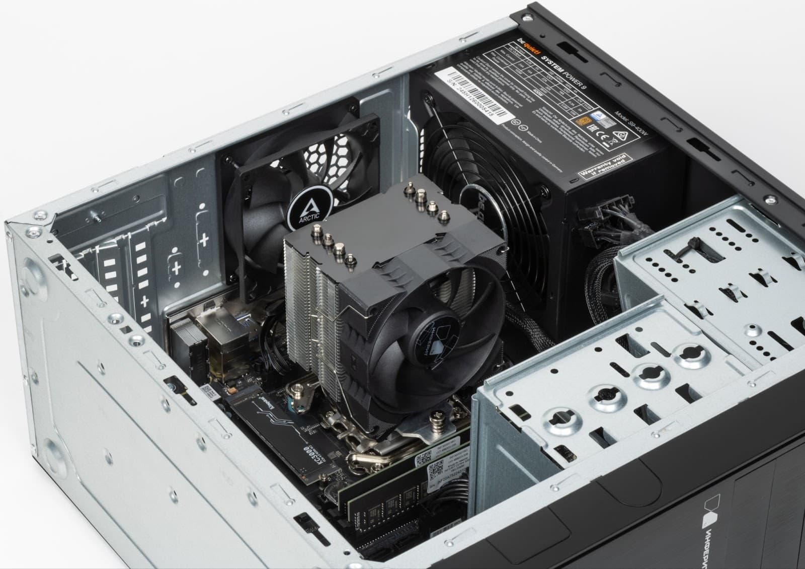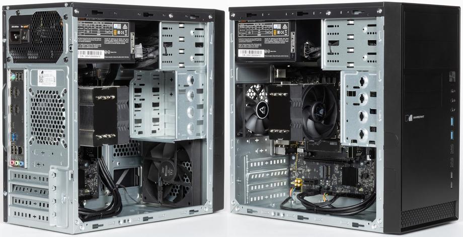 В качестве корпусных вентиляторов используются ID-COOLING AF-125-K и ARCTIC F9 PWM PST Black, воздушный поток организован по классической схеме «спереди назад», в условиях офисной загрузки этого более чем достаточно. Пылевые фильтры отсутствуют, что для сравнительно бюджетного корпуса простительно. Но всё же с ними было бы намного лучше: в условиях офиса, а тем более — производства пыль является серьёзной проблемой, а чистка внутреннего пространства ПК зачастую осуществляется крайне нерегулярно.