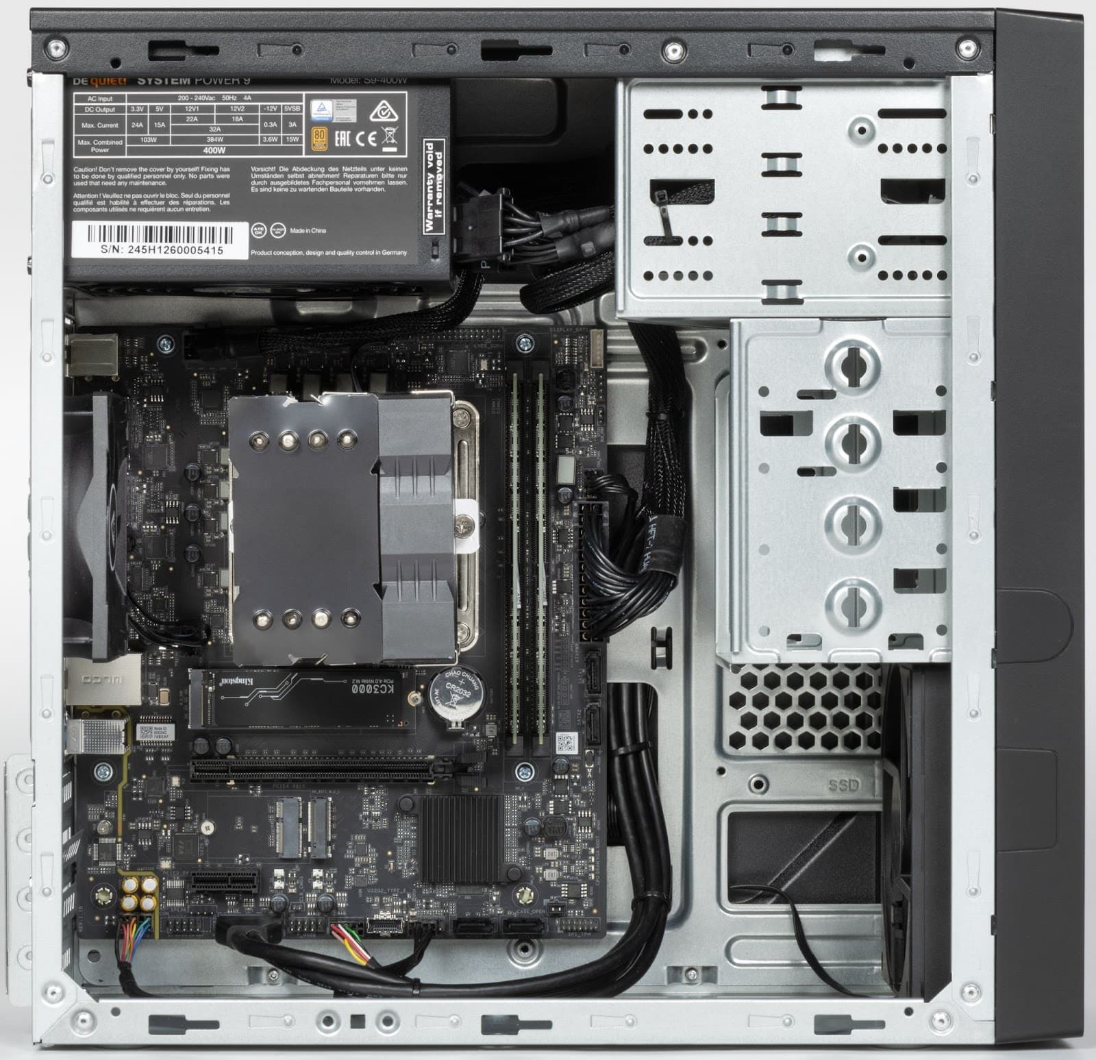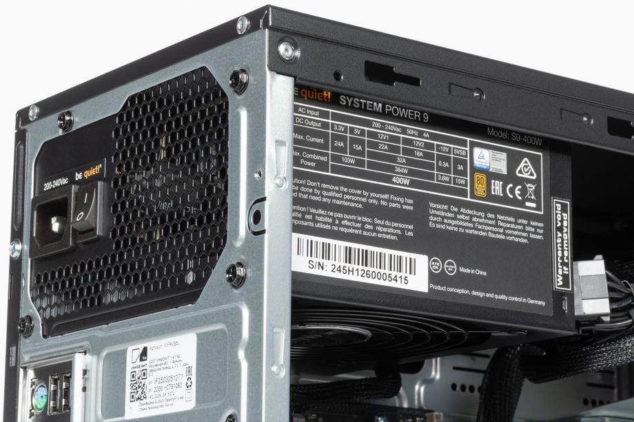 В качестве блока питания установлен be quiet! System Power 9 400W — надёжное и добротное решение от уважаемого бренда. Несмотря на то, что это не самая мощная модель в линейке, 400 Вт более чем достаточно для конфигурации без дискретной видеокарты, даже с учетом возможных апгрейдов. Блок сертифицирован по стандарту 80 PLUS Bronze, что гарантирует достойную энергоэффективность и минимальные потери на нагрев. Особо стоит отметить низкий уровень шума: вентиляторы be quiet! традиционно тихие даже при повышенной нагрузке. А с учётом того, что общая энергопотребность системы невелика, кулер БП будет работать в щадящем режиме, не внося заметного вклада в акустический фон.