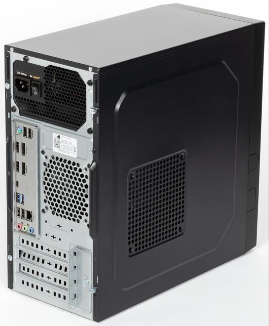 Задняя часть корпуса оформлена в типично утилитарном ключе: оцинкованный металл без декоративного покрытия, строго функциональные вырезы, открытые винтовые соединения. Блок питания вынесен в верхнюю часть корпуса — классическое решение, которое ныне встречается всё реже. На одной из боковых стенок есть перфорация и отверстия для крепления дополнительного вентилятора, который в данном случае не используется — система прекрасно охлаждается имеющимися двумя корпусными и процессорным кулерами.