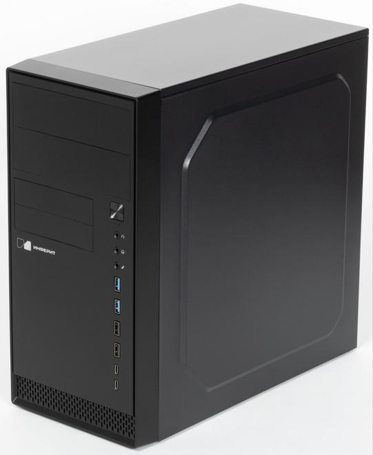 Корпус ПК выполнен в минималистичном утилитарном стиле — всё просто, строго и без лишних декоративных элементов, как и должно быть на рабочем месте. Единственным визуальным акцентом служит лаконичный логотип производителя на передней панели. Типоразмер Mini Tower подразумевает компактность, что позволяет легко разместить системный блок на столе рядом с монитором, где ему самое место — чуть ниже мы увидим, почему.