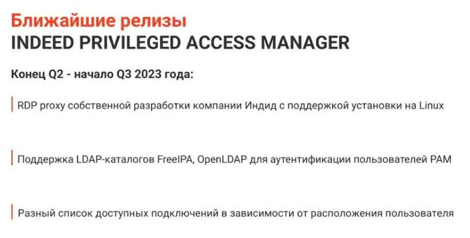 It is clear that ordinary employees do not know the passwords of privileged users, they have access only to their account. If some incident occurs in the company, then you can see screenshots, logs and in a short time eliminate such an incident. The slide shows the releases planned for the summer of this year.