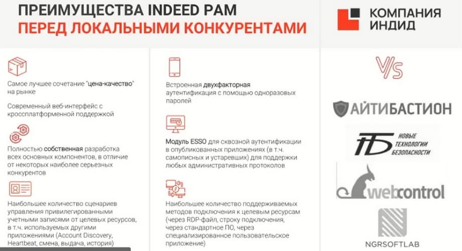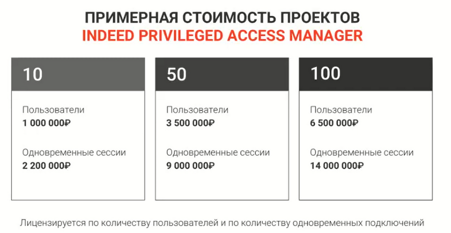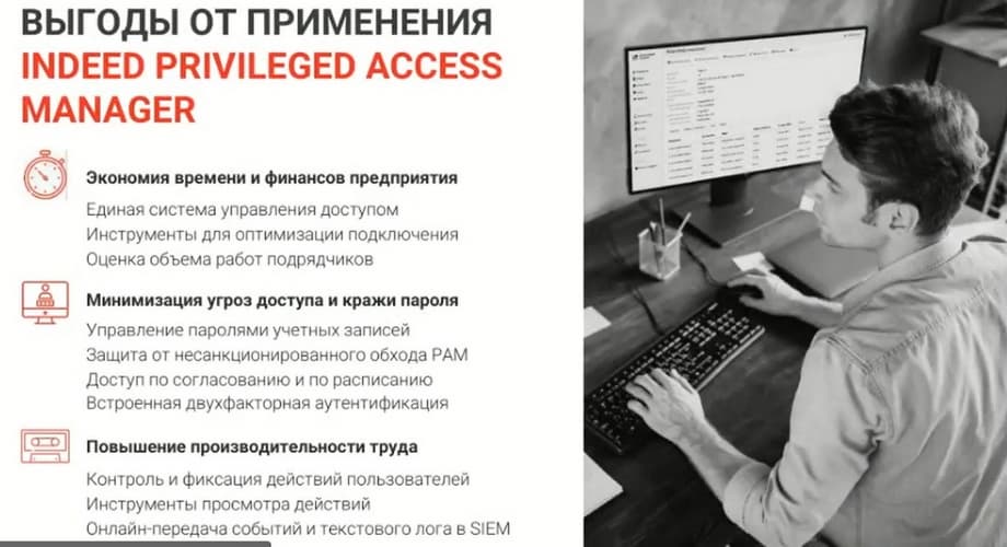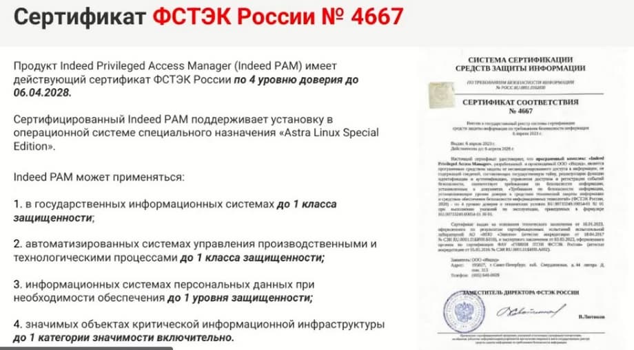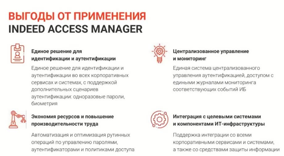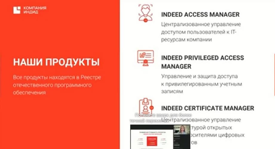 The first product is Indeed Access Manager. Centralized management of user access to the company's IT resources. The second product is Indeed Privileged Access Manager management and protection of access to privileged accounts. And the third product is - Indeed Certificate Manager – centralized management of digital certificates and tokens.