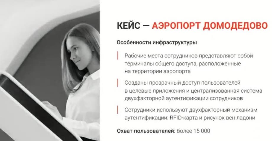 The first interesting case is Domodedovo Airport. Here, the customer does not have their own stationary places for all employees. For such employees, they have installed a device like the one in the picture. It looks like a kiwi machine, through which we once topped up our mobile account. Such employees have their card, have a palm. They approach this device, attach the card, then the palm. The scanner scans the palm vein pattern. And, if everything is successful, the vein pattern matches, they are allowed into their work session, they can view confidential information about themselves, can write an application or perform other actions. What would happen if there was no second factor? Such an employee may lose their card. At best, this card will be found by their colleague. They will be able to log in with it, see, for example, the colleague's salary, can take some confidential information. But in any case, such a situation will not be critical for the company as a whole. If this card is obtained by an attacker, then they will be able to gain access to all information about the employee and about other employees of the company, and steal confidential information from the company.