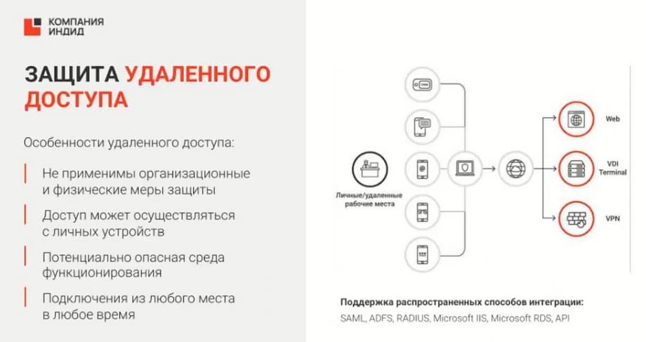 Also we always highlight the remote access protection module with a separate slide. Because it's no secret that since the beginning of the pandemic and now, in the current realities, remote work has become very relevant. Many customers are transferring their employees to remote work, and employees can connect to the company's internal network from any device from outside. And the customer must be sure that such a connection will be secure, it will also be protected by a second factor or many factors of authentication. In this case, we close the need for secure access to the company's internal resources from the external network.